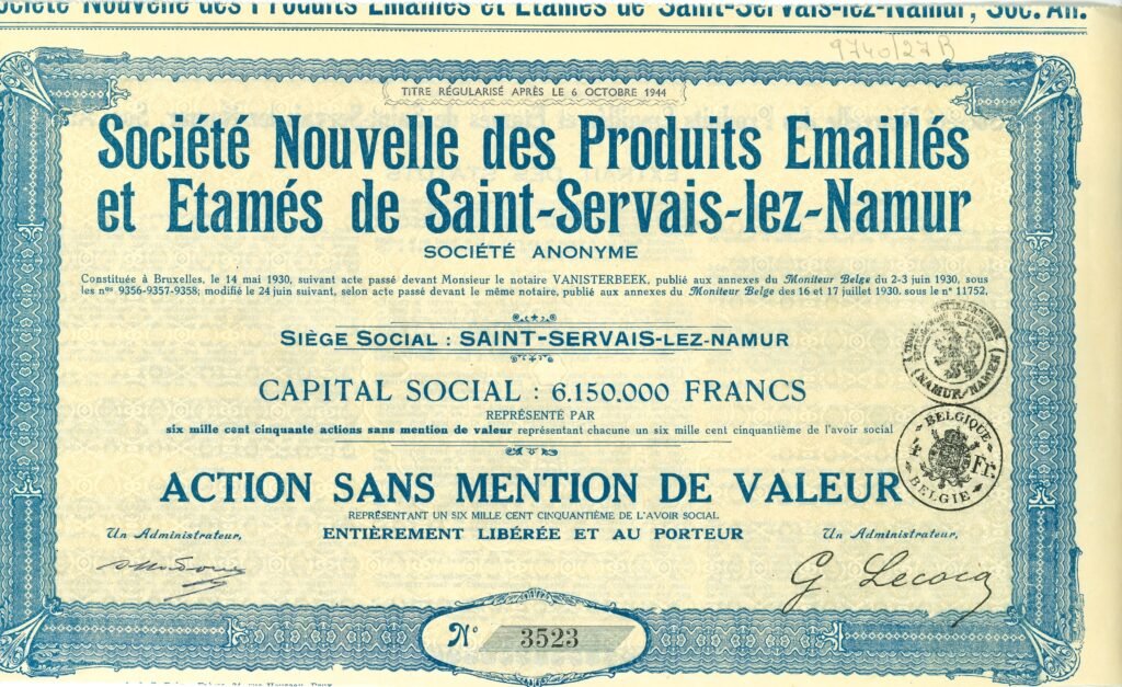 Illustration 1 : Action sans mention de valeur émise par la Société nouvelle des Produits émaillés et étamés de Saint-Servais-lez-Namur n°3523 (Société archéologique de Namur, Fonds Famille Thonet